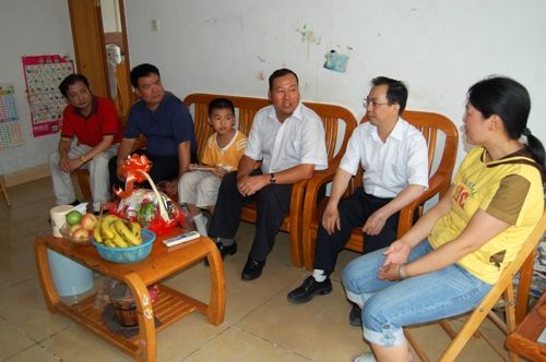 图为罗业凤总司理等向导在员工龙如演家中探望其眷属并与之亲热攀谈