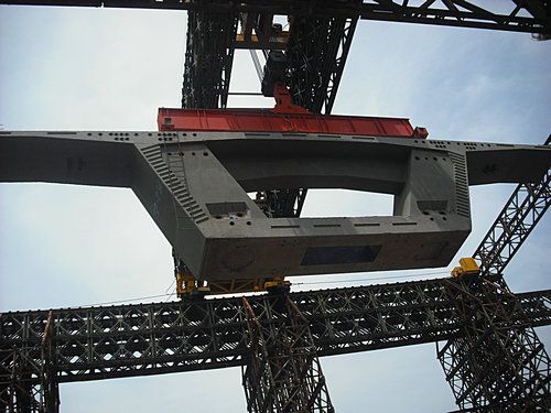 •     2011年1月21日上午11时38分,陪同着响亮而强烈的鞭炮声,巴巴奥约河大桥32#墩0#块被水上门吊吊离运梁浮箱,经由空中滑翔顺遂装置到位,这标记着巴巴奥约河大桥水上门吊经由设计、施工、试吊等环节正式投入施工生产。