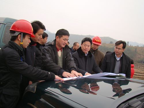 县长杨恩维(前排右三)、副县长潘远益与建设办有关认真人、项目向导班子审查设计图纸